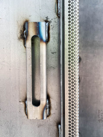 The entrance door design is simple and transparent, blending seamlessly with the front perforated metal wall and allows occupants to see if someone is on the other side. FritsJürgens pivots were used for ease of opening that allows bikers to slip into the pavilion. Tolerances were extremely small making for precise fabrication, preformed by our professor Paul.